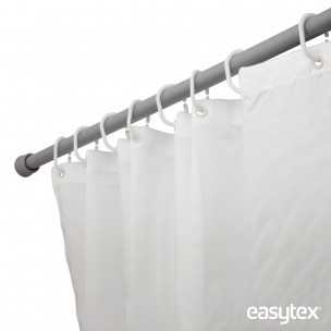 Le rideau de douche est conçu en textile souple et imperméable et est vendu avec un set d'anneaux de douche en plastique blanc.